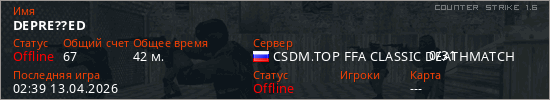 Играет на Counter Strike 1.6 сервере. Страна: РоссияПервый раз замечен 19:09 11.04.2026