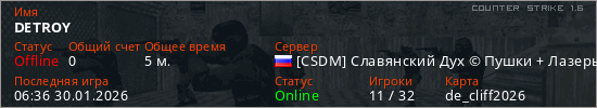 Играет на Counter Strike 1.6 сервере. Страна: РоссияПервый раз замечен 06:34 30.01.2026