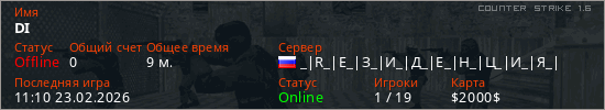 Играет на Counter Strike 1.6 сервере. Страна: РоссияПервый раз замечен 10:47 23.02.2026