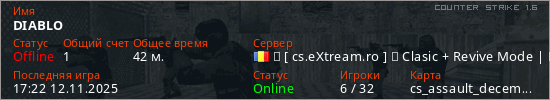 Играет на Counter Strike 1.6 сервере. Страна: РумынияПервый раз замечен 12:51 07.01.2025