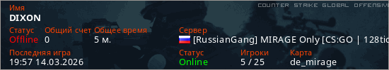 Играет на Counter Strike Global Offensive сервере. Страна: РоссияПервый раз замечен 19:51 14.03.2026
