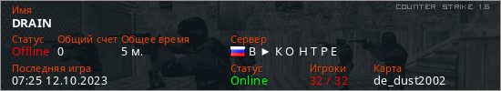 Играет на Counter Strike 1.6 сервере. Страна: РоссияПервый раз замечен 07:17 12.10.2023