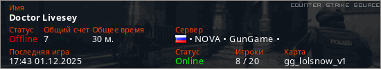 Играет на Counter Strike Source сервере. Страна: РоссияПервый раз замечен 16:17 14.12.2024