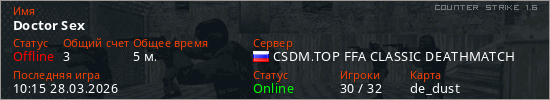 Играет на Counter Strike 1.6 сервере. Страна: РоссияПервый раз замечен 10:10 28.03.2026