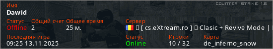 Играет на Counter Strike 1.6 сервере. Страна: РумынияПервый раз замечен 00:49 27.10.2024