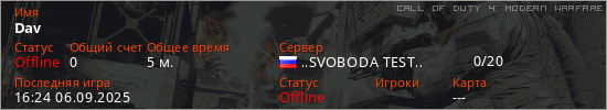 Играет на Call of Duty 4: Modern Warfare сервере. Страна: РоссияПервый раз замечен 16:22 06.09.2025
