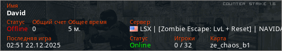 Играет на Counter Strike 1.6 сервере. Страна: СШАПервый раз замечен 02:42 22.12.2025