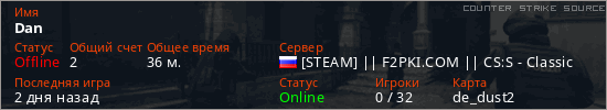 Играет на Counter Strike Source сервере. Страна: РоссияПервый раз замечен 11:58 29.03.2026