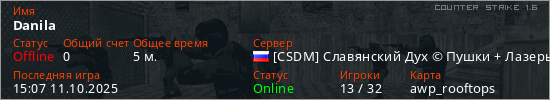 Играет на Counter Strike 1.6 сервере. Страна: РоссияПервый раз замечен 14:54 11.10.2025