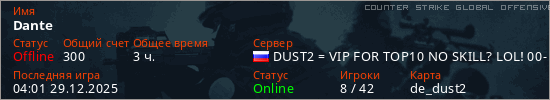 Играет на Counter Strike Global Offensive сервере. Страна: РоссияПервый раз замечен 22:14 20.03.2025
