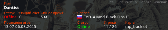 Играет на Call of Duty 4: Modern Warfare сервере. Страна: РоссияПервый раз замечен 13:05 06.03.2025
