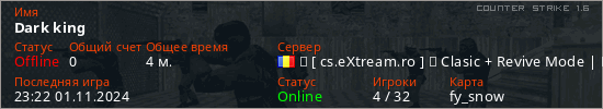 Играет на Counter Strike 1.6 сервере. Страна: РумынияПервый раз замечен 23:16 01.11.2024