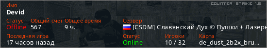 Играет на Counter Strike 1.6 сервере. Страна: РоссияПервый раз замечен 19:52 16.10.2025
