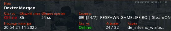 Последний раз был в сети 20:54 21.11.2025 Игрок с таким ником замечен на 27 серверах
