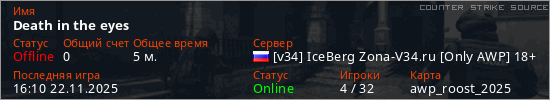 Играет на Counter Strike Source сервере. Страна: РоссияПервый раз замечен 16:02 22.11.2025