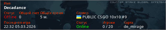 Играет на Counter Strike Global Offensive сервере. Страна: УкраинаПервый раз замечен 22:00 05.03.2026