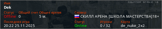 Играет на Counter Strike 1.6 сервере. Страна: РоссияПервый раз замечен 20:20 25.11.2025