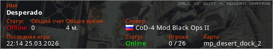 Играет на Call of Duty 4: Modern Warfare сервере. Страна: РоссияПервый раз замечен 22:12 25.03.2026