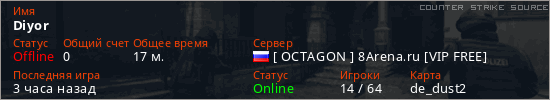 Играет на Counter Strike Source сервере. Страна: РоссияПервый раз замечен 15:53 15.02.2026