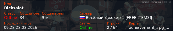 Играет на Team Fortress 2 сервере. Страна: РоссияПервый раз замечен 19:59 27.03.2026