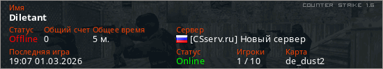 Играет на Counter Strike 1.6 сервере. Страна: РоссияПервый раз замечен 19:05 01.03.2026