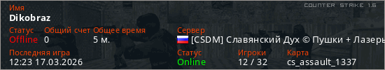 Играет на Counter Strike 1.6 сервере. Страна: РоссияПервый раз замечен 11:51 17.03.2026