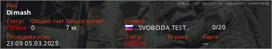 Играет на Call of Duty 4: Modern Warfare сервере. Страна: РоссияПервый раз замечен 23:02 05.03.2025
