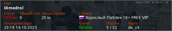 Играет на Counter Strike 1.6 сервере. Страна: РоссияПервый раз замечен 20:49 07.02.2025