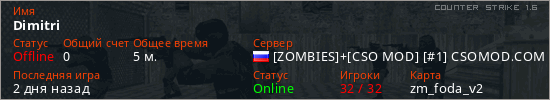 Играет на Counter Strike 1.6 сервере. Страна: РоссияПервый раз замечен 09:40 08.03.2026