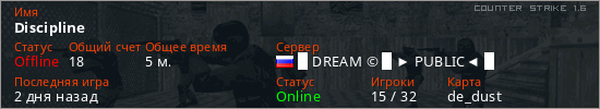 Играет на Counter Strike 1.6 сервере. Страна: РоссияПервый раз замечен 15:28 28.03.2026