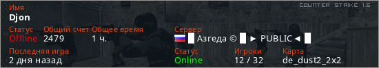 Играет на Counter Strike 1.6 сервере. Страна: РоссияПервый раз замечен 02:14 09.04.2026