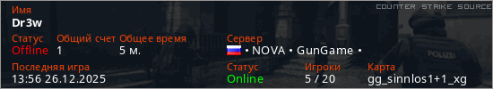 Играет на Counter Strike Source сервере. Страна: РоссияПервый раз замечен 13:33 26.12.2025