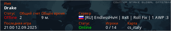 Играет на Counter Strike Global Offensive сервере. Страна: РоссияПервый раз замечен 11:08 07.09.2025