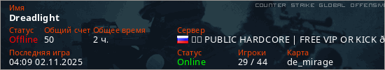 Играет на Counter Strike Global Offensive сервере. Страна: РоссияПервый раз замечен 05:47 25.07.2025