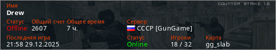 Играет на Counter Strike 1.6 сервере. Страна: РоссияПервый раз замечен 04:16 17.11.2025