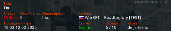 Играет на Counter Strike 1.6 сервере. Страна: РоссияПервый раз замечен 19:00 12.02.2025