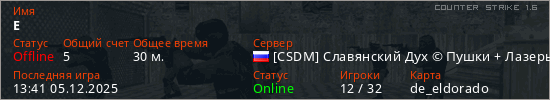 Играет на Counter Strike 1.6 сервере. Страна: РоссияПервый раз замечен 16:38 29.12.2024