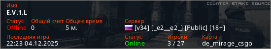 Играет на Counter Strike Source сервере. Страна: РоссияПервый раз замечен 22:15 04.12.2025