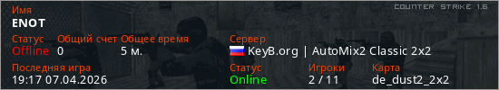 Играет на Counter Strike 1.6 сервере. Страна: РоссияПервый раз замечен 19:13 07.04.2026