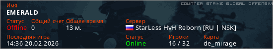 Играет на Counter Strike Global Offensive сервере. Страна: РоссияПервый раз замечен 13:13 19.02.2026