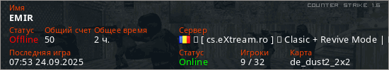 Играет на Counter Strike 1.6 сервере. Страна: РумынияПервый раз замечен 23:03 21.12.2024