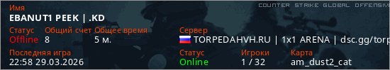 Играет на Counter Strike Global Offensive сервере. Страна: РоссияПервый раз замечен 22:43 29.03.2026
