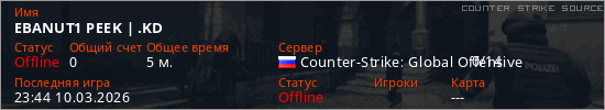Играет на Counter Strike Source сервере. Страна: РоссияПервый раз замечен 22:03 10.03.2026