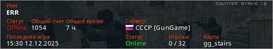 Играет на Counter Strike 1.6 сервере. Страна: РоссияПервый раз замечен 13:00 18.11.2025