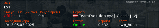 Играет на Counter Strike 1.6 сервере. Страна: ЛатвияПервый раз замечен 20:24 04.03.2025