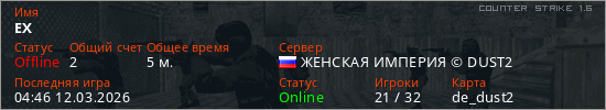 Играет на Counter Strike 1.6 сервере. Страна: РоссияПервый раз замечен 04:44 12.03.2026