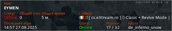Играет на Counter Strike 1.6 сервере. Страна: РумынияПервый раз замечен 14:43 27.08.2025
