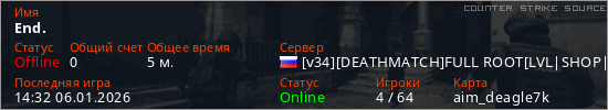 Играет на Counter Strike Source сервере. Страна: РоссияПервый раз замечен 14:21 06.01.2026