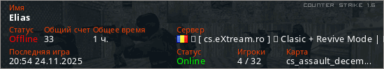 Играет на Counter Strike 1.6 сервере. Страна: РумынияПервый раз замечен 14:36 03.11.2024