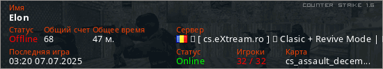 Играет на Counter Strike 1.6 сервере. Страна: РумынияПервый раз замечен 23:56 04.01.2025